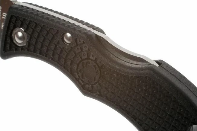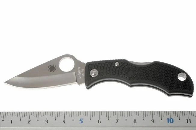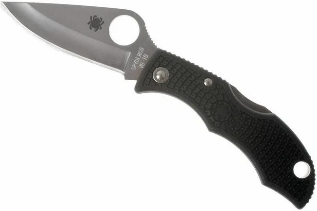 Amazingly compact keyring knife. However, still a real Spyderco product, featuring no less than a VG10 steel blade, een back lock mechanism and FRN handle. This little gem obviously does not have a pocket clip but instead, a keyring hole.